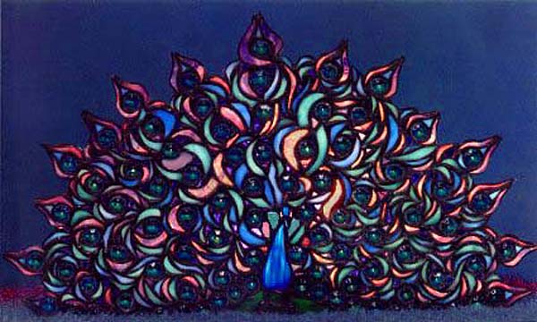 About this glass: "Peacock" was a study for a large window never constructed. There are over 500 individual tiny pieces of glass constructed around the crystal eyes in the feathers. The bottom edge measures about a foot.