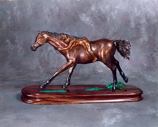 | About this sculpture: "Simpatico" is for sale for $3,800. It is a bronze, with diamond chips set in the eyes and malachite inlaid into a walnut base with a tongue oil finish. (Available without the malachite and diamonds.) It stands approximately a 10 inches tall and is approximately 20 inches long, 5 inches wide. This is the artist proof of a limited edition of 11. |